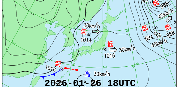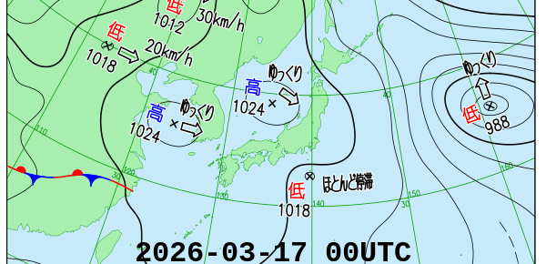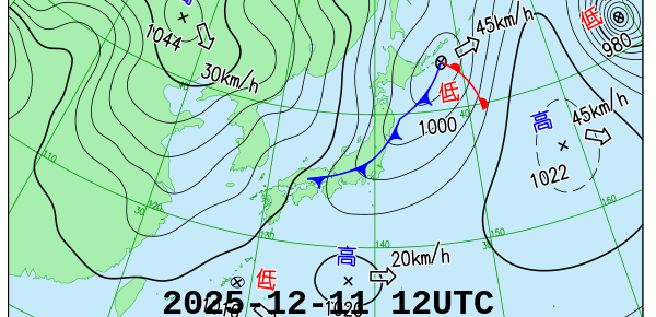 今日の天気図と似ている天気図の日を調べています。似ている度合の判断は気圧場の相関係数に依っています。気象庁が発表する天気図に合わせて毎日6時間毎に内容を更新しています。