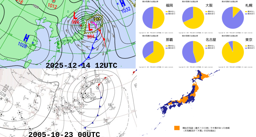 今夜21時予想天気図の類似天気図を 582例抽出しました(うち上位100例中、